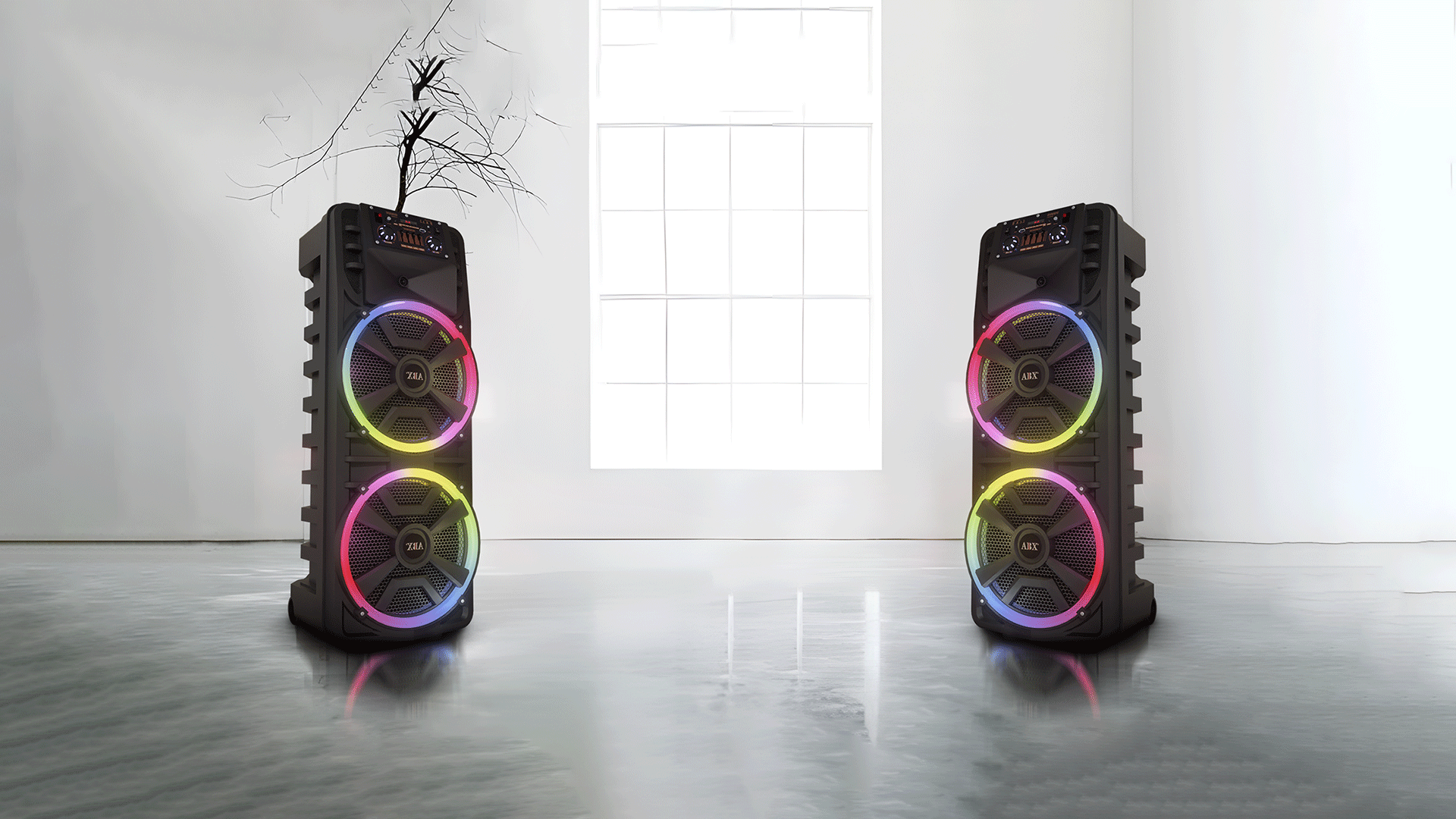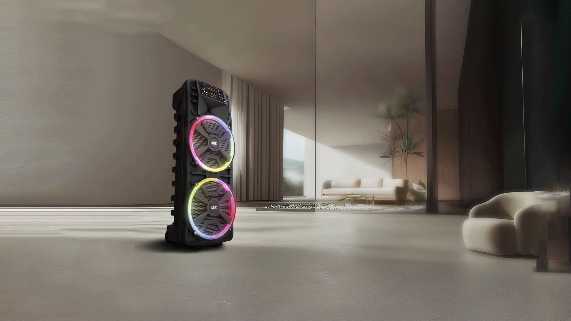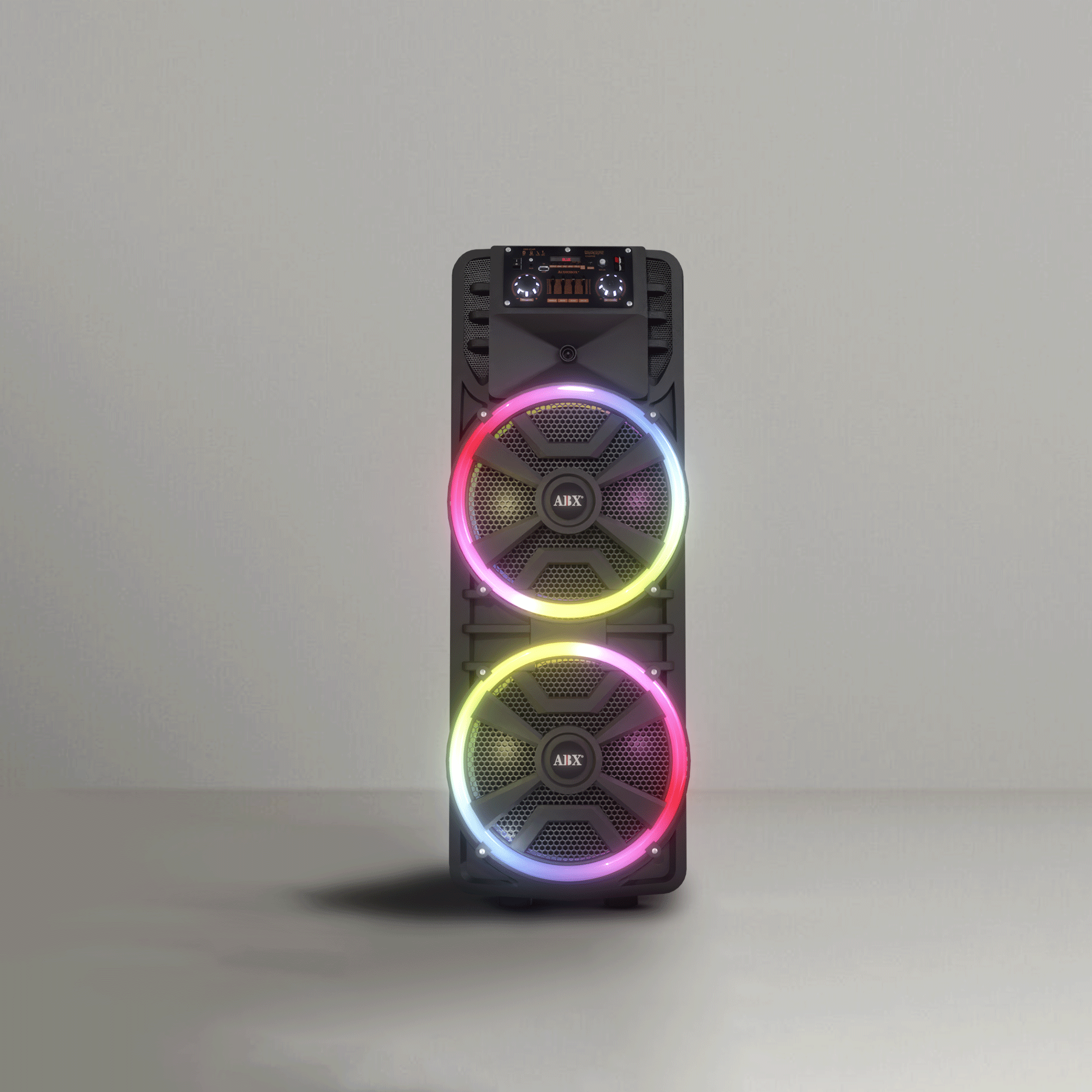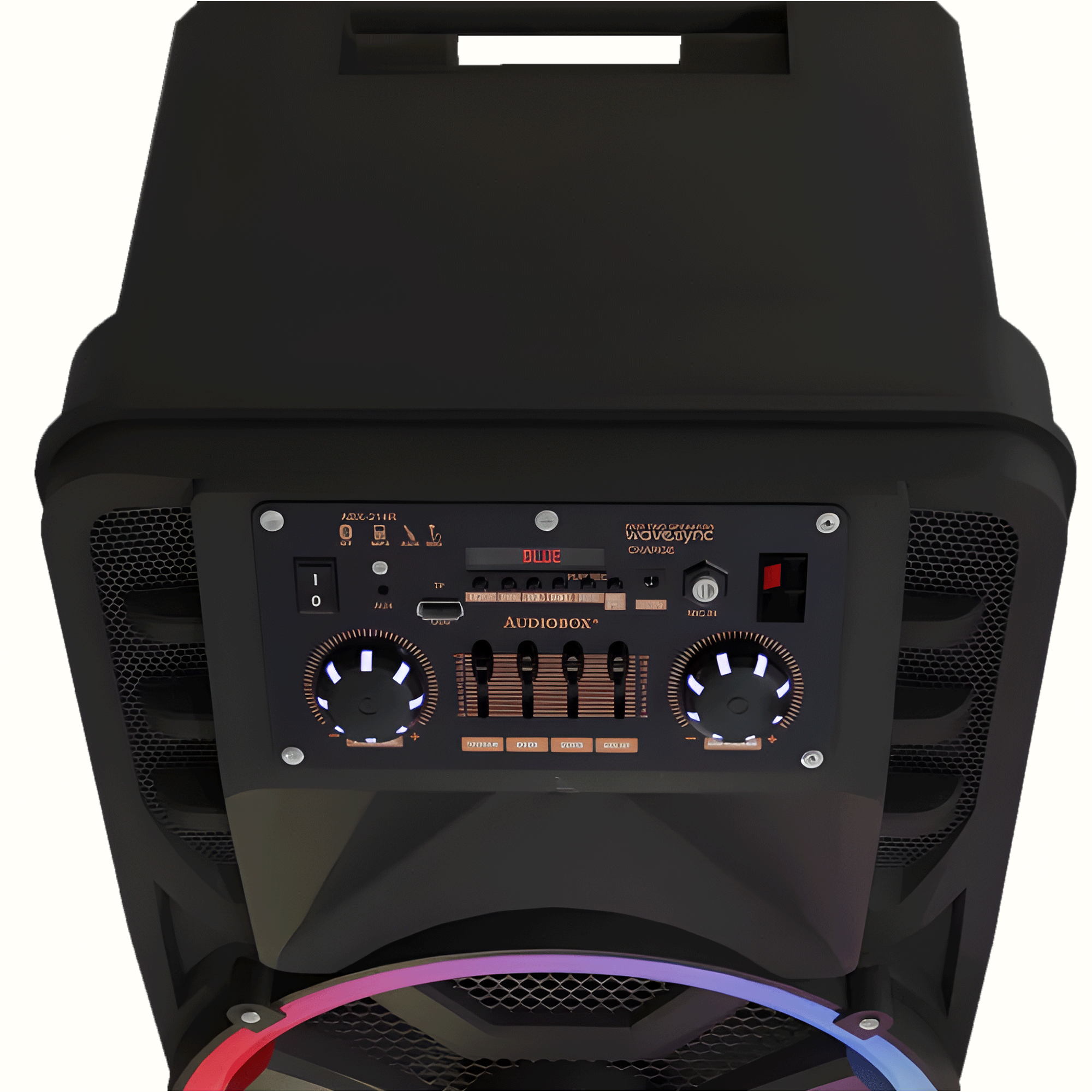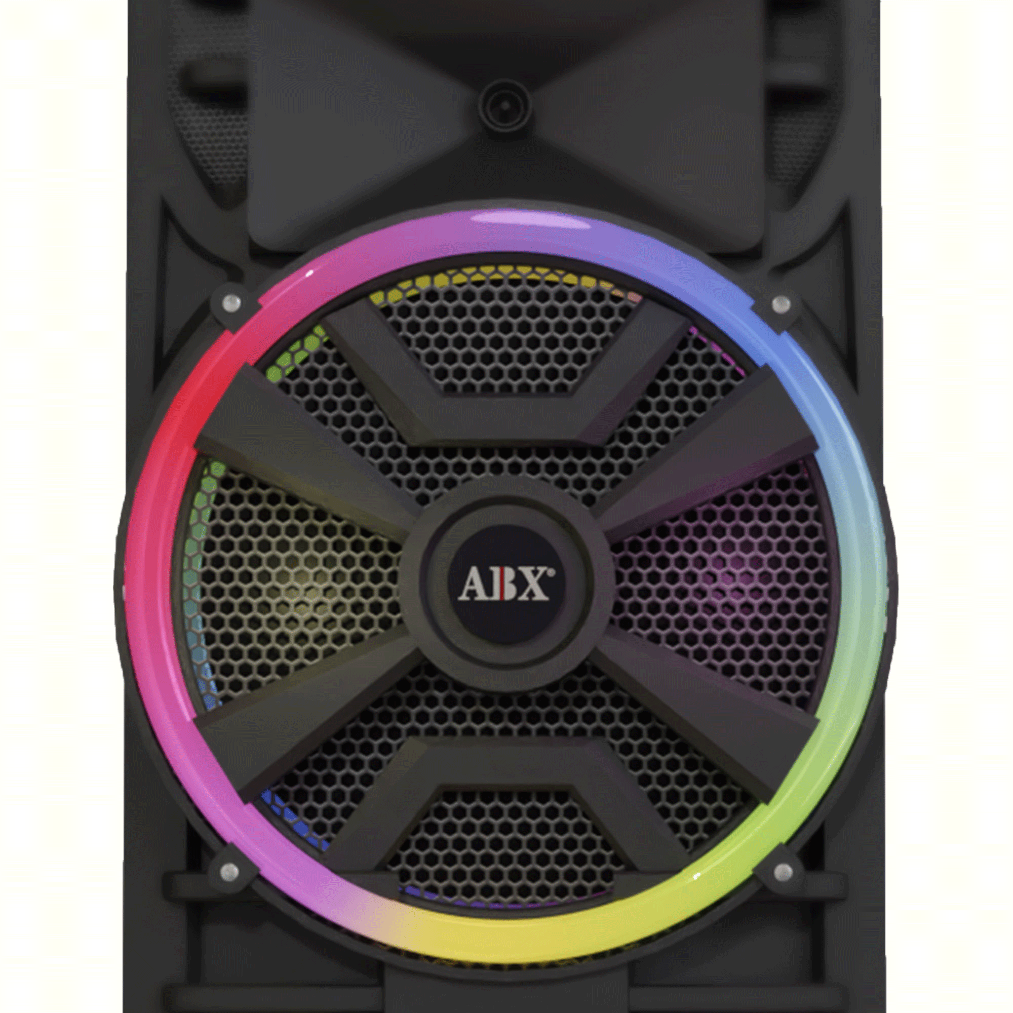The ABX-214R is a powerful dual 12” PA speaker, designed to bring high-quality sound and vibrant visuals to your events. Featuring WaveSync™ technology and sound-activated RGB party lights, it delivers an immersive experience. With multiple input options, built-in controls, and a long-lasting rechargeable battery, this speaker is ideal for parties, performances, and large gatherings. Its handle and wheels make it easy to transport, ensuring you can take the party anywhere.