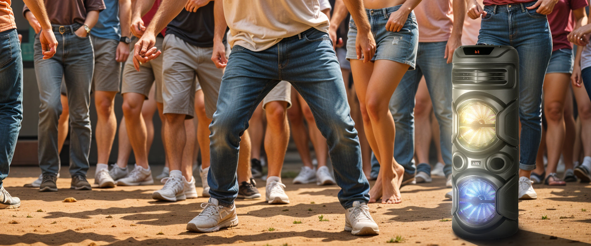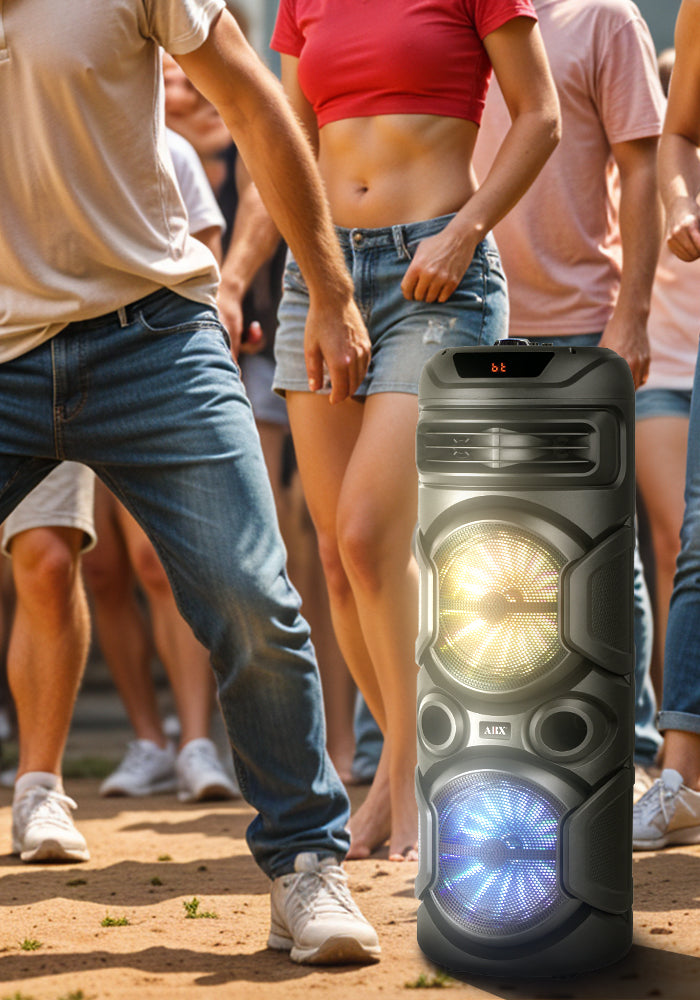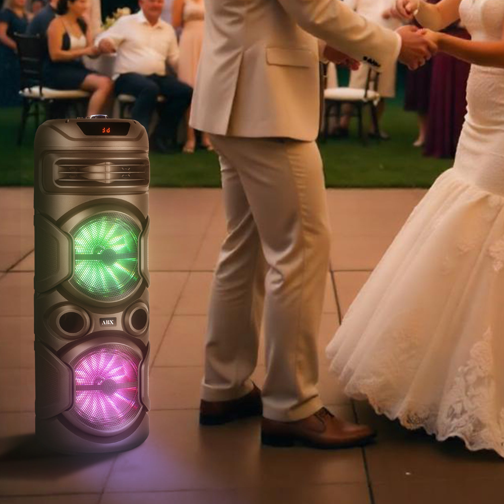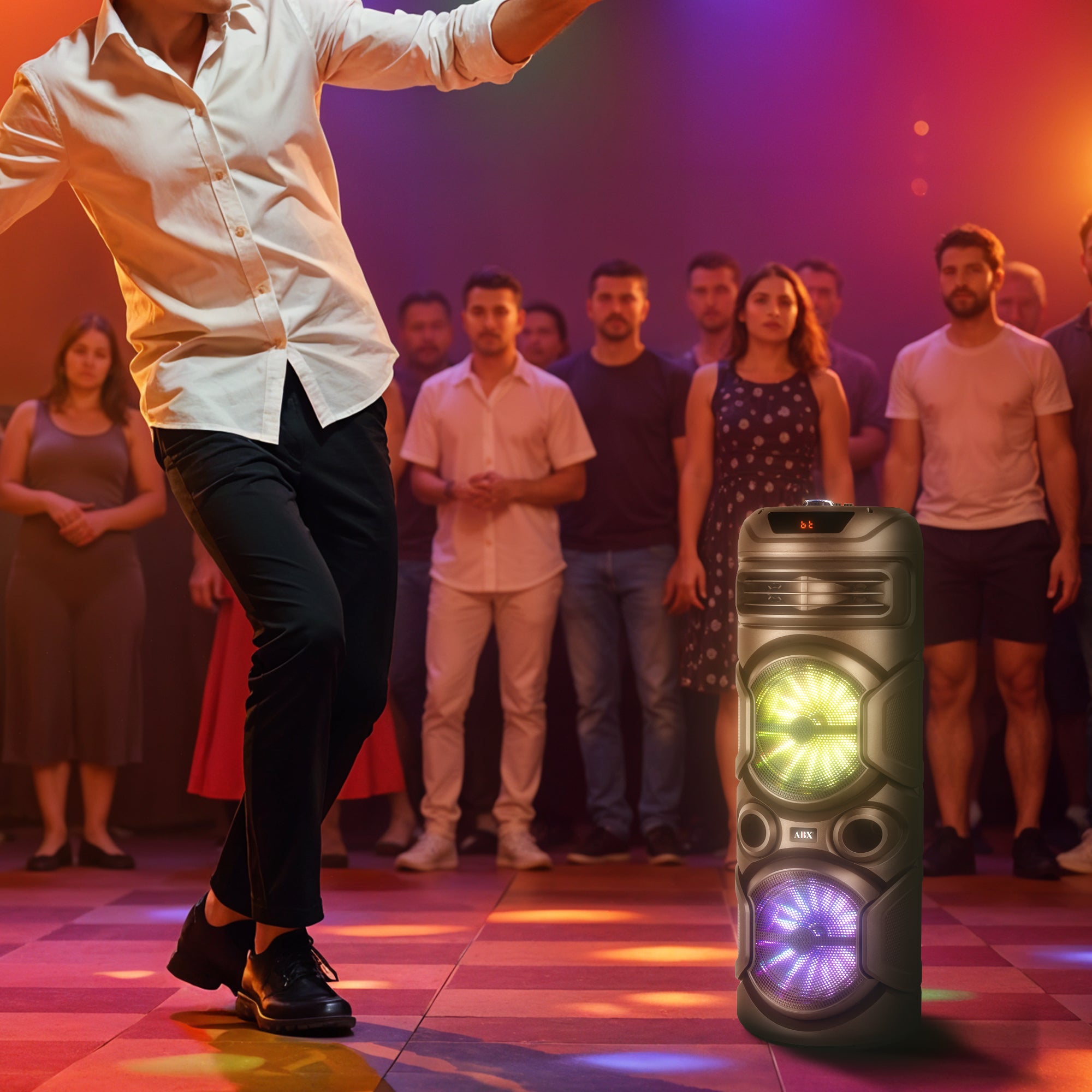 The ABX-2900R is a powerful dual 8” PA speaker designed for events and gatherings. Equipped with WaveSync™ technology, RGB woofer lights, and multiple input options, it provides an immersive sound and light experience. With a built-in rechargeable battery, handle, and wheels, it’s designed for portability and ease of use. Perfect for both indoor and outdoor use, this speaker ensures you’re always ready to amplify the fun.